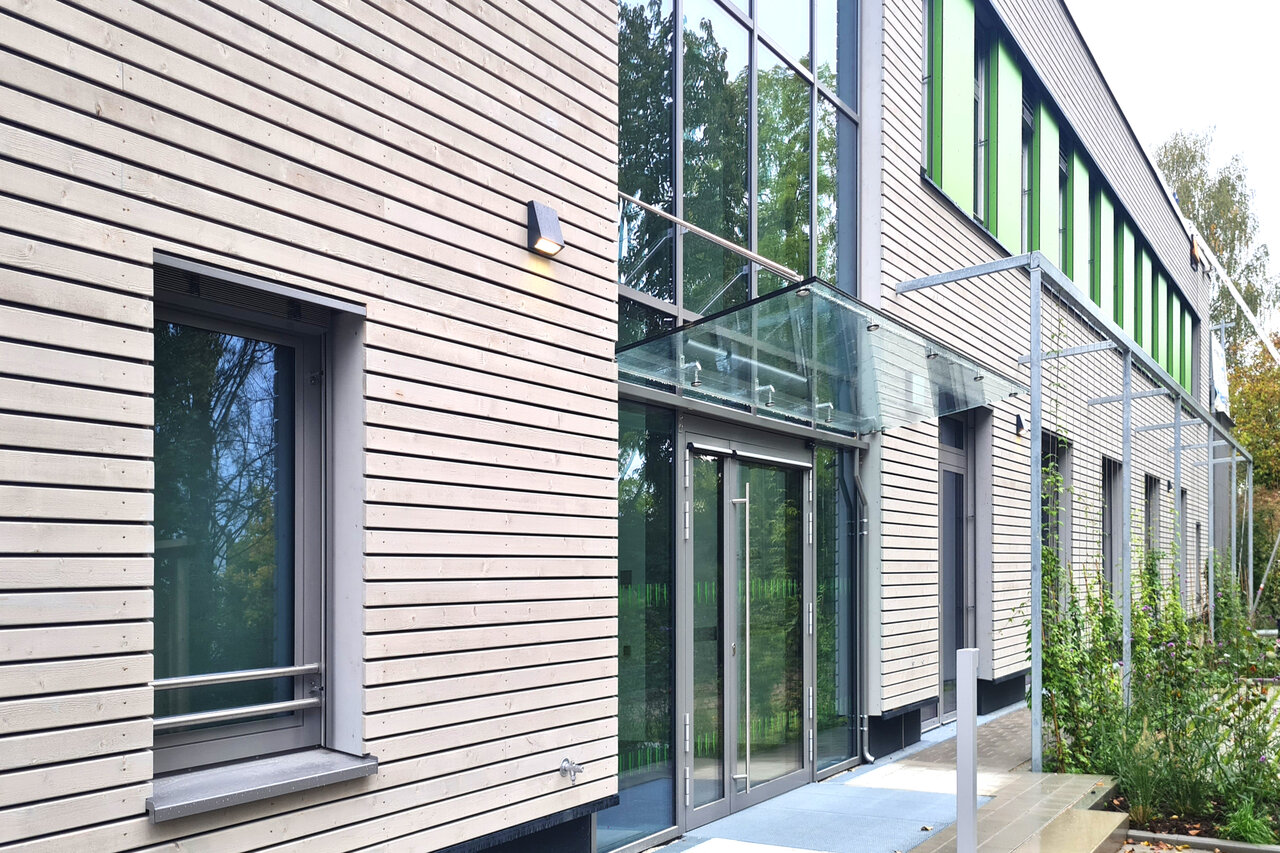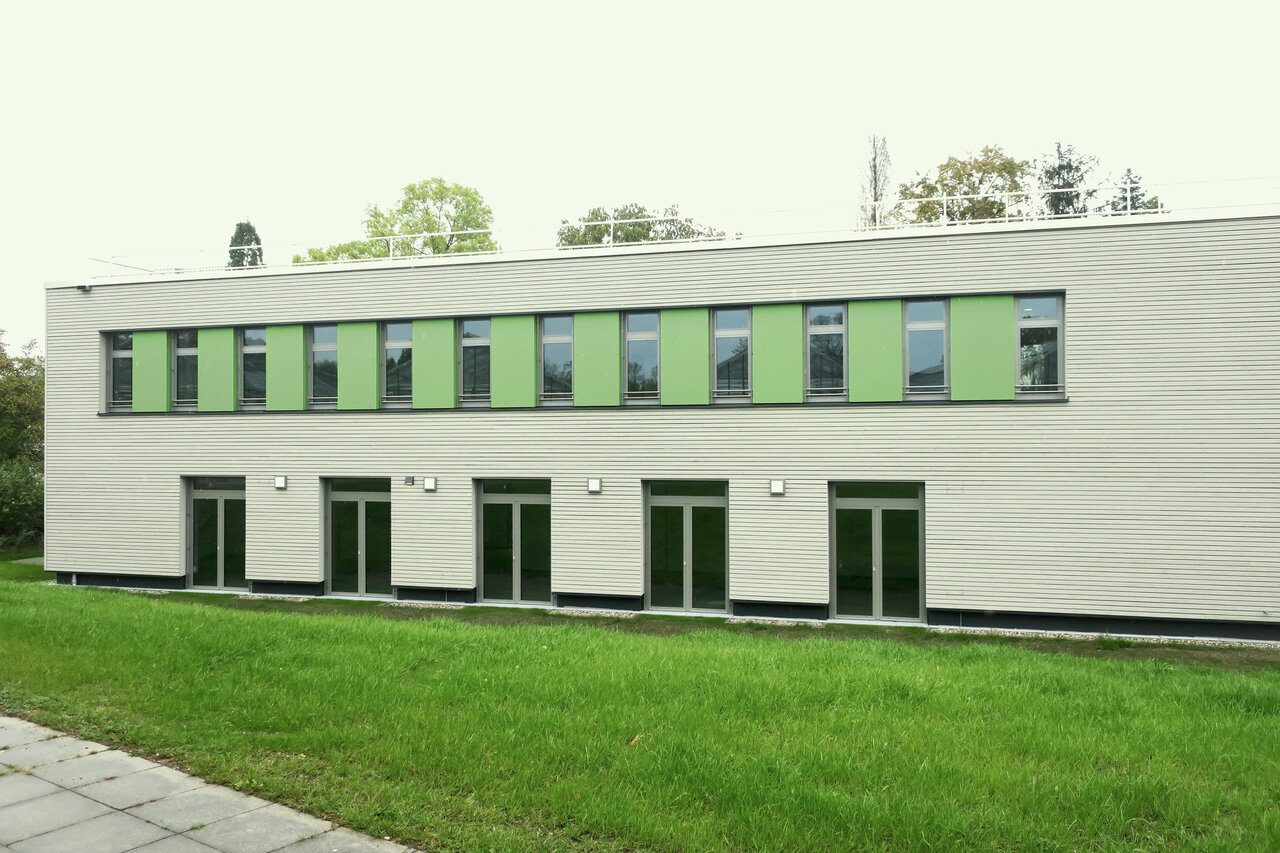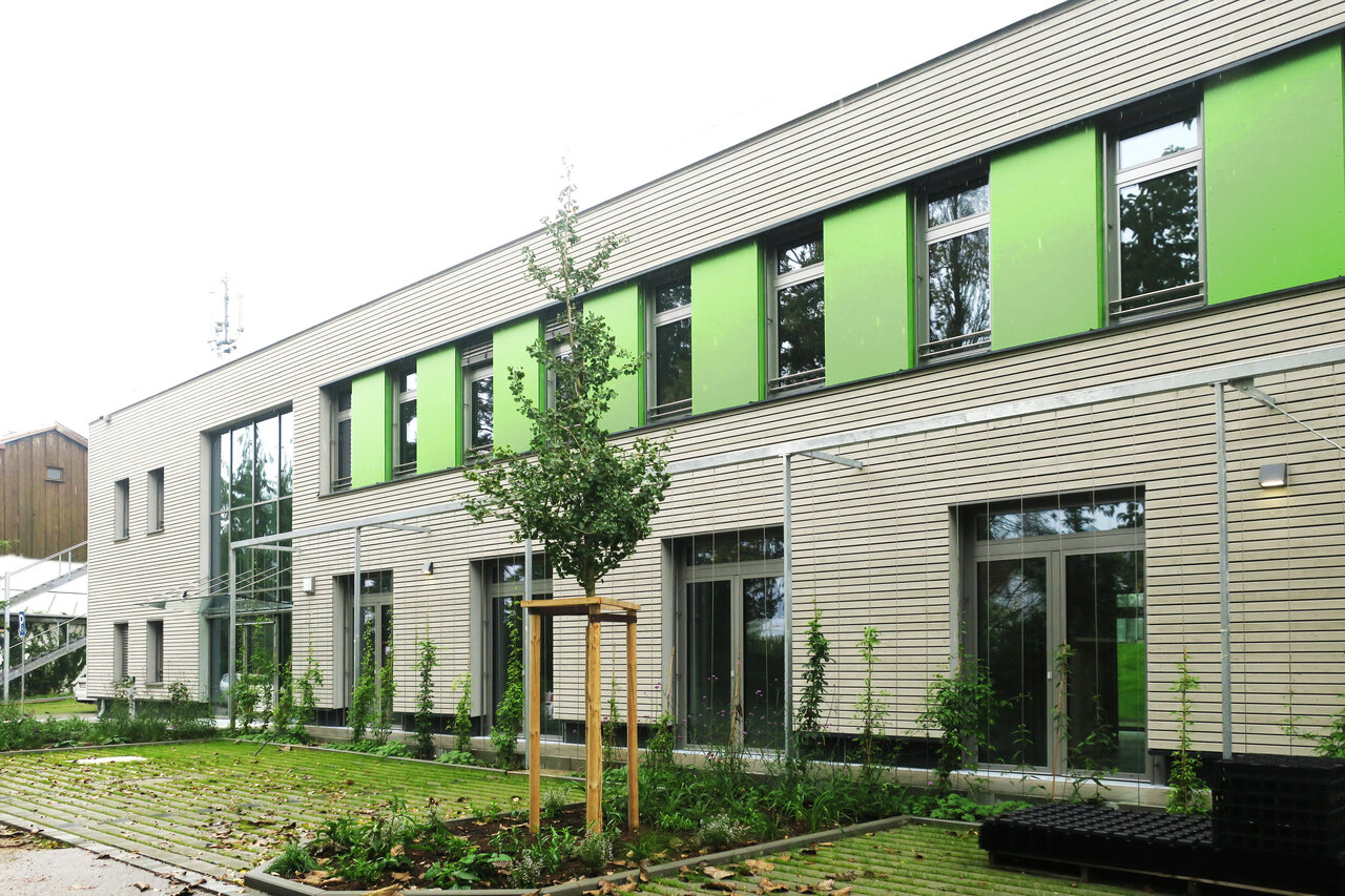 | Im Zuge der Hightech-Agenda errichtete der Freistaat Bayern auf dem Campus der Hochschule Weihenstephan-Triesdorf ein 2-geschossiges Seminar- und Verwaltungsgebäude. Im Erdgeschoss ist ein offener Seminarbereich mit Showküche und digitalem Hörsaal geplant, der mit mobilen Trennwänden flexibel unterteilbar ist. Im Sommer kann man über großzügige Terrassentüren die angrenzende Freifläche mitnutzen. Im Obergeschoss befindet sich der Verwaltungsbereich mit Personalraum. Die Dachfläche wird zu Forschungszwecken von der Hochschule genutzt. Hier wird das Zusammenspiel von Dachbegrünung und Photovoltaik in verschiedenen Ausführungen untersucht und gemessen. Für das Gebäude ist eine Regenwassernutzung vorgesehen. Mittel- bzw. langfristig soll der Baukörper erweitert werden. Daher wurde die Planung bereits so angelegt, dass eine Erweiterung im laufenden Betrieb ohne große Einschränkungen möglich ist. |
