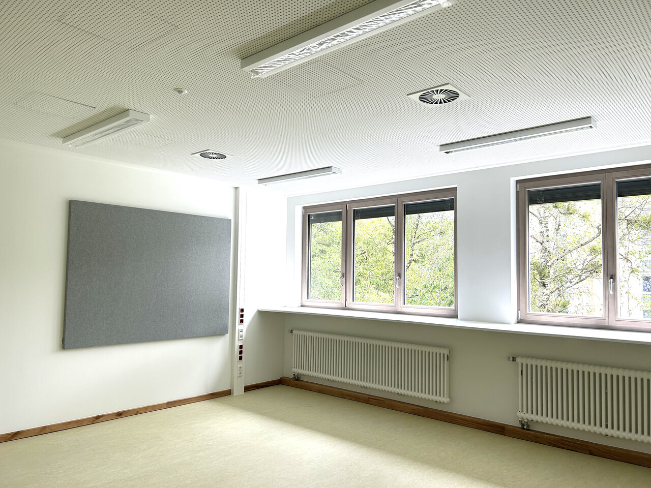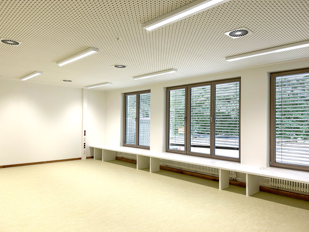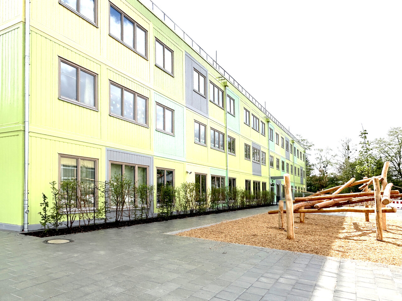 | Auf dem Grundstück der Grundschule an der Königswieser Straße in München sollte für den Zeitraum des Abbruchs und Neubaus der bestehenden Grundschule und darüber hinaus für eine Standzeit von etwa zehn Jahren ein Ausweichgebäude errichtet werden. Das Gebäude beinhaltet im Erdgeschoss ein Haus für Kinder mit drei Kindergarten- und drei Hortgruppenräumen sowie eine Versorgungsküche (Frisch-Mischküche) für die Mittagsverpflegung von 130 Kindern. In den beiden Obergeschossen werden die dreizügige Grundschule sowie drei Förderschulklassen untergebracht, jeweils zuzüglich aller erforderlichen Fach- und Nebenräume. Der Baukörper wird kompakt am südlichen Grundstücksrand platziert, sodass der das Grundstück einrahmende alte Baumbestand fast vollständig erhalten bleiben kann, aber trotzdem großzügige Freiflächen für die verschiedenen Nutzungen zur Verfügung stehen. Die Ausführung als Stahlmodulgebäude mit hohem Vorfertigungsgrad ermöglicht die sehr kurze Bauzeit von nur fünf Monaten. Die Umsetzung des Gebäudes nach Ende der Standzeit ist vorgesehen und wurde bei Planung und Ausschreibung berücksichtigt. |